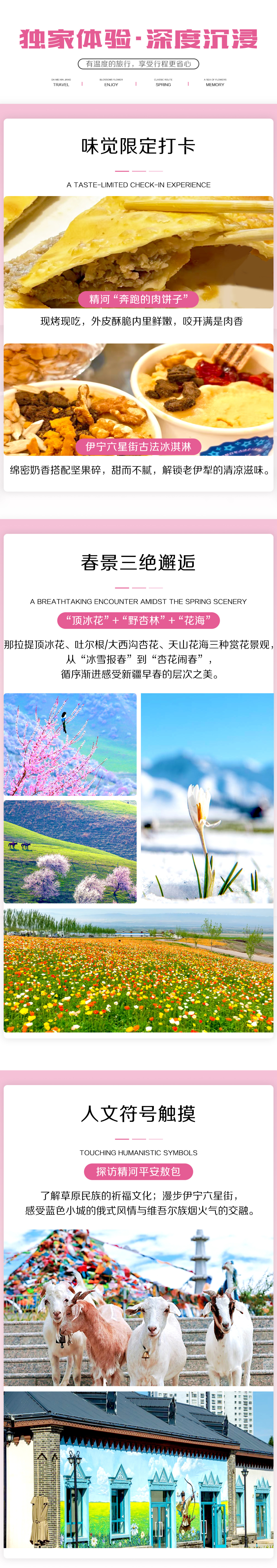 今日早起前往恰西森林公园,恰西森林是伊犁最先绿的草原,当未融的白雪和浩荡的草原邂逅,浪漫的春光便惊艳了整片山谷,恰西森林就摇身一变,成了画卷里的“塞上江南”。草原、雪山、森林同框最美的地方就是“恰西画卷”。游览结束后前往天山花海景区,当春风温柔拂过,整个景区像是被打翻了调色盘。大片大片的二月兰肆意绽放,紫的如梦,每一朵都亭亭玉立,在微风中轻轻摇曳,虞美人,苹果花,桃花也都竞相开放,争抢着诉说春天的故事。前往伊宁,抵达后首先打卡六星街的古法冰淇淋,绵密的奶香搭配香脆的坚果碎,甜而不腻,消解旅途疲惫。之后可在六星街自由漫步,感受俄式建筑与维吾尔族风情交融的独特韵味,蓝色的门窗、盛开的鲜花都是绝佳的拍照背景。后前往酒店入住。