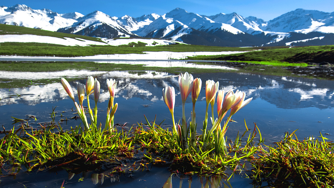 今日乘车沿精伊高速前往那拉提草原。沿途欣赏天山北麓的河谷春色,下午抵达那拉提草原后,重点探寻顶冰花的踪迹。这种倔强的小花顶着残雪绽放,白色花瓣搭配嫩黄花蕊,在辽阔草原上星星点点,与远处的雪山、松林构成一幅绝美的早春画卷。若天气晴好,可在草原上静候日落,看夕阳为雪山和草原镀上暖金色。后前往酒店办理入住。