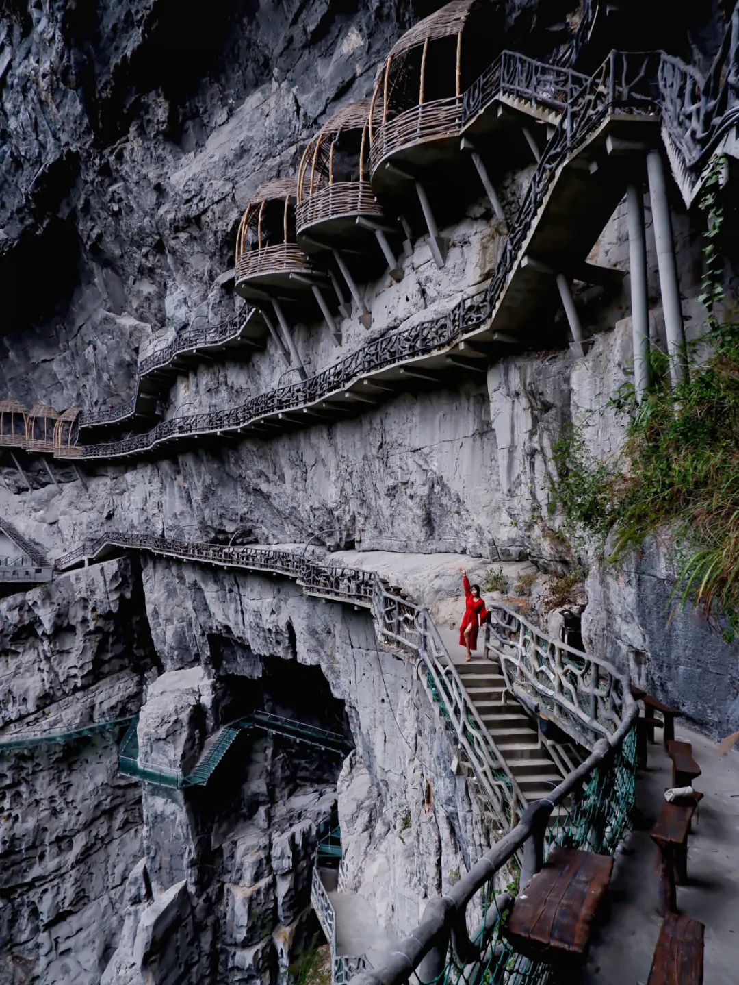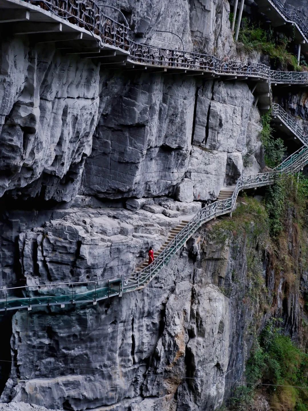 棉花天坑,深326米,宽305米,形似大型漏斗,一削千丈的绝壁直插地下,栈道在悬臂上盘旋引向坑底,犹如地球表面与地宫世界的连接口,险、奇、峻、雄、秀、美!置身其中,如入秘境。
