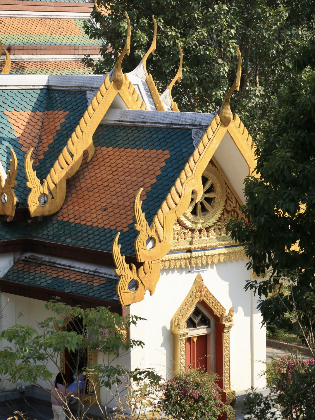 泰佛殿是中泰文化交流的典范,集中了泰国古代雄奇、精巧的建筑风格。重檐多面式屋顶装鱼鳞瓦、封檐板装向上的黄色图形,柱头、山墙、窗户等等巧思设计,无不让人惊叹。