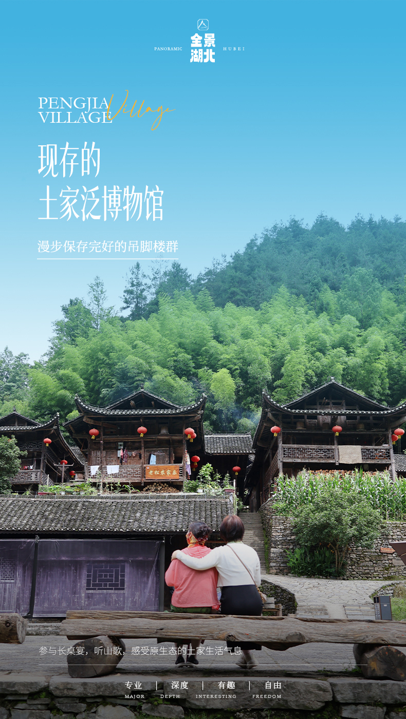 彭家寨坐落在湖北恩施土家族苗族自治州武陵山北麓的彭家寨。全寨50多户近300口人,均系土家族。彭家寨吊脚楼群依托观音山,建于山脚斜坡上,寨前是一排稻田,面向龙潭河,河上架有铁索桥。山清水秀,人杰地灵,古色古香,如同一颗璀璨的明珠,闪烁在宣恩县西南边陲。