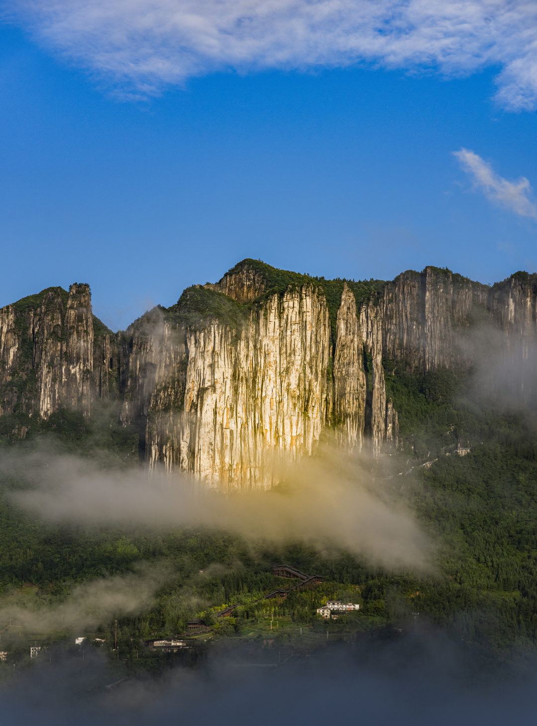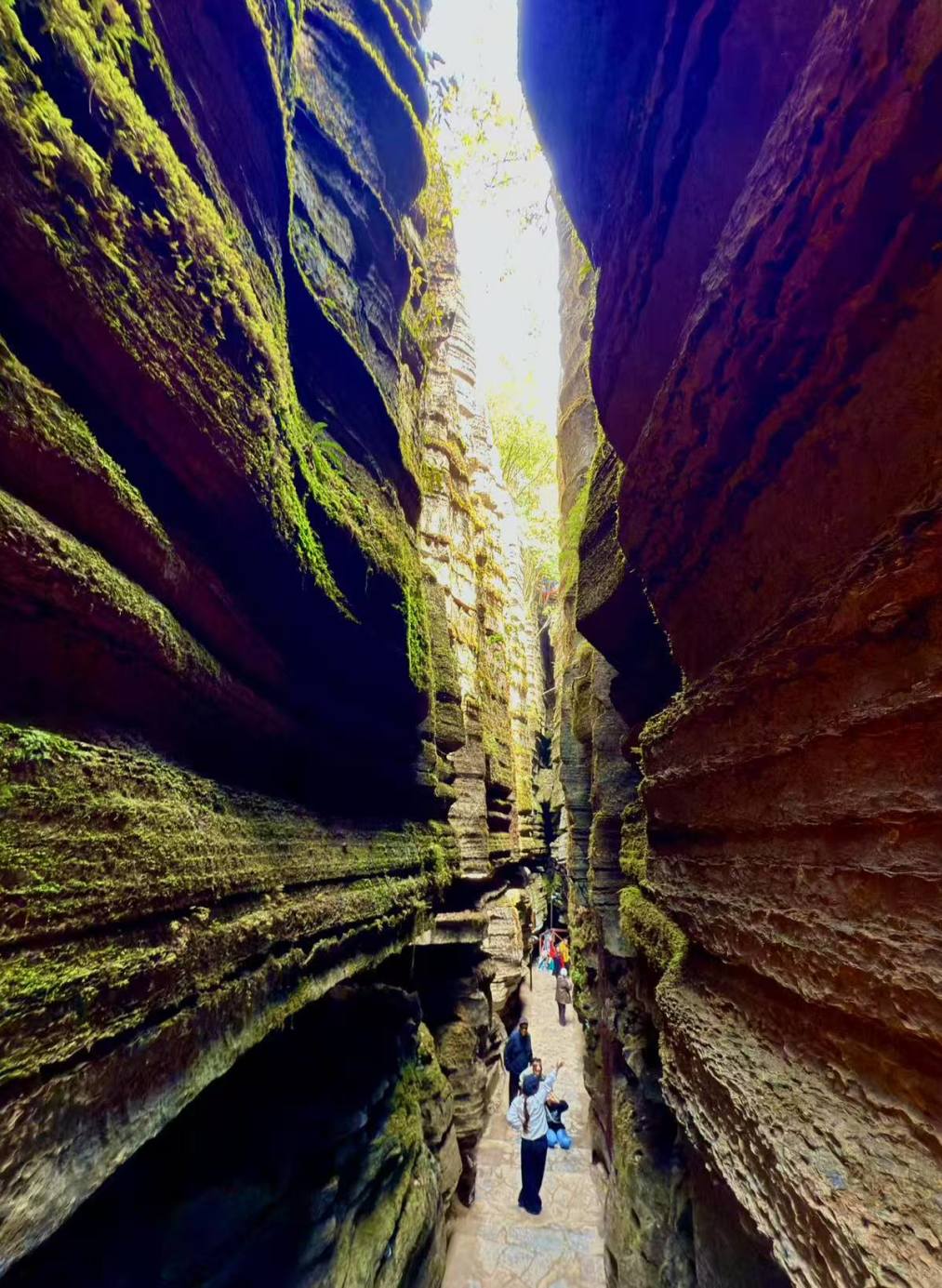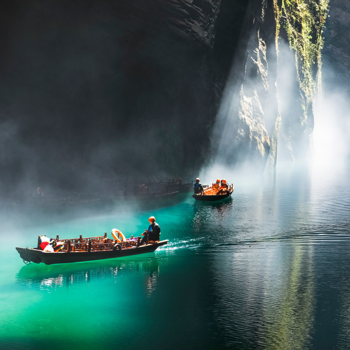 两岸峭壁似巨人拔地而起,笔直陡峭,近得仿佛触手可得。船行向前,天空渐窄,只剩一线湛蓝,仿若时空压缩,阳光挤入,在水面洒下金色光斑,如梦似幻。