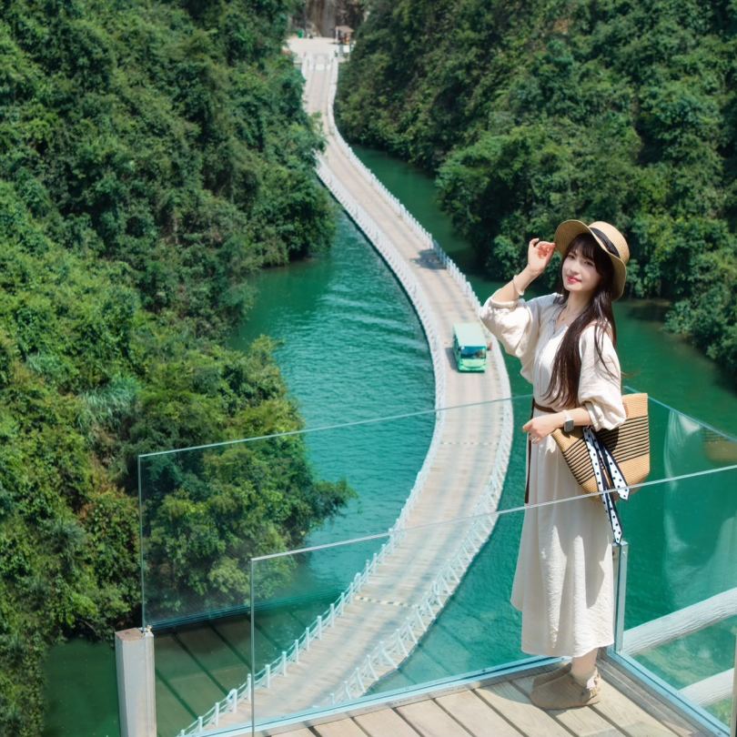 沿着四周峭壁凌空高悬的栈道向下缓行,青山连绵起伏,满目翠绿欲滴,那是大自然用最细腻的笔触勾勒的生机画卷;